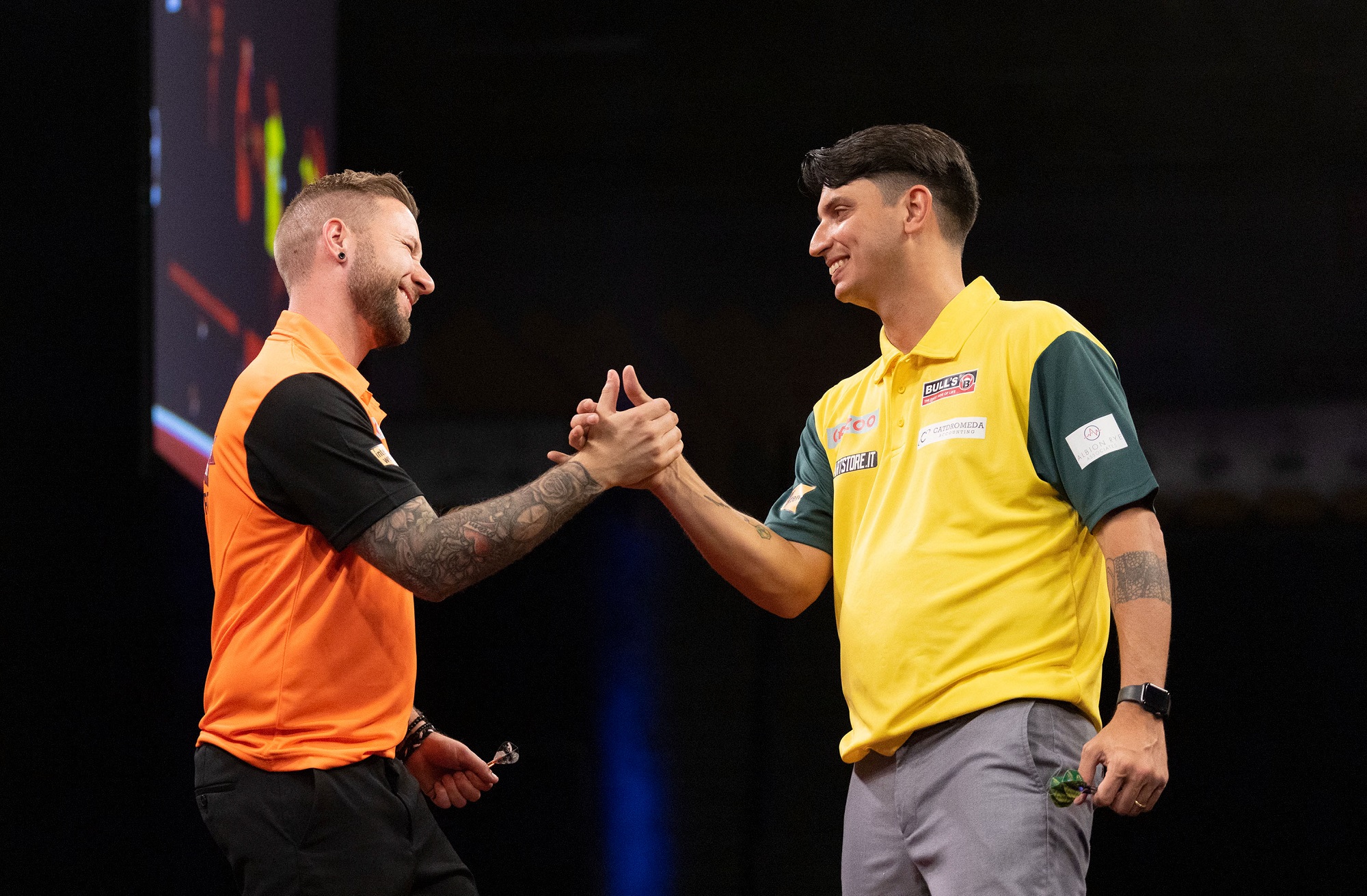 New look Dutch pair Danny Noppert and Dirk van Duijvenbode settled any pre-tournament nerves, being the only nation on the opening day to win by a whitewash victory. Diogo Portela and Arthur Valle had to stand and watch Winmau star Danny Noppert finish three consecutive legs, as the third seeds cruised to a 5-0 victory.