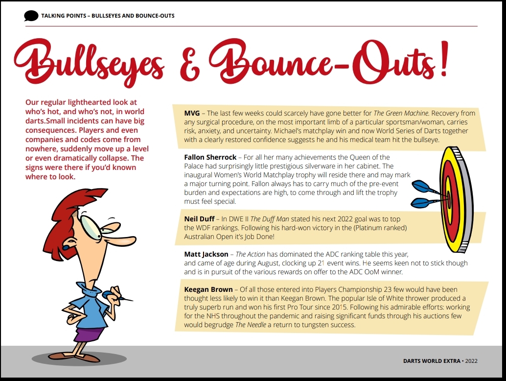 Bullseye’s and Bounceouts are a lighthearted look at who’s ‘on the up’ and who’s in a slump. They feature regularly in Darts World Extra. Our 4th edition looked like this: