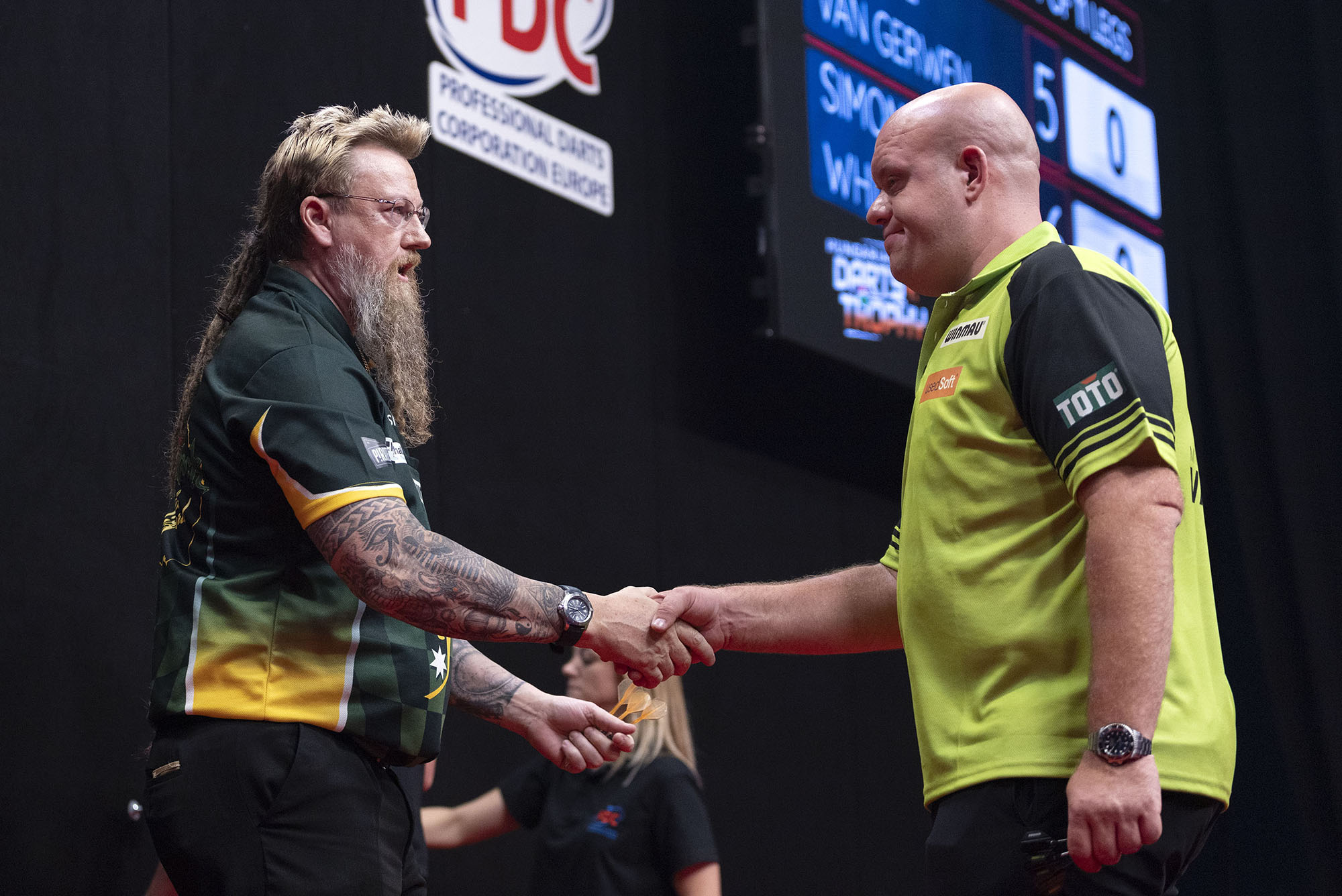 Simon Whitlock defeated Michael van Gerwen again on the PDC Circuit, this time in the Hungarian Darts Trophy repeating his result two weeks ago in Australia after winning 6-5 to reach the Last 16 at the BOK Sportcsarnok.