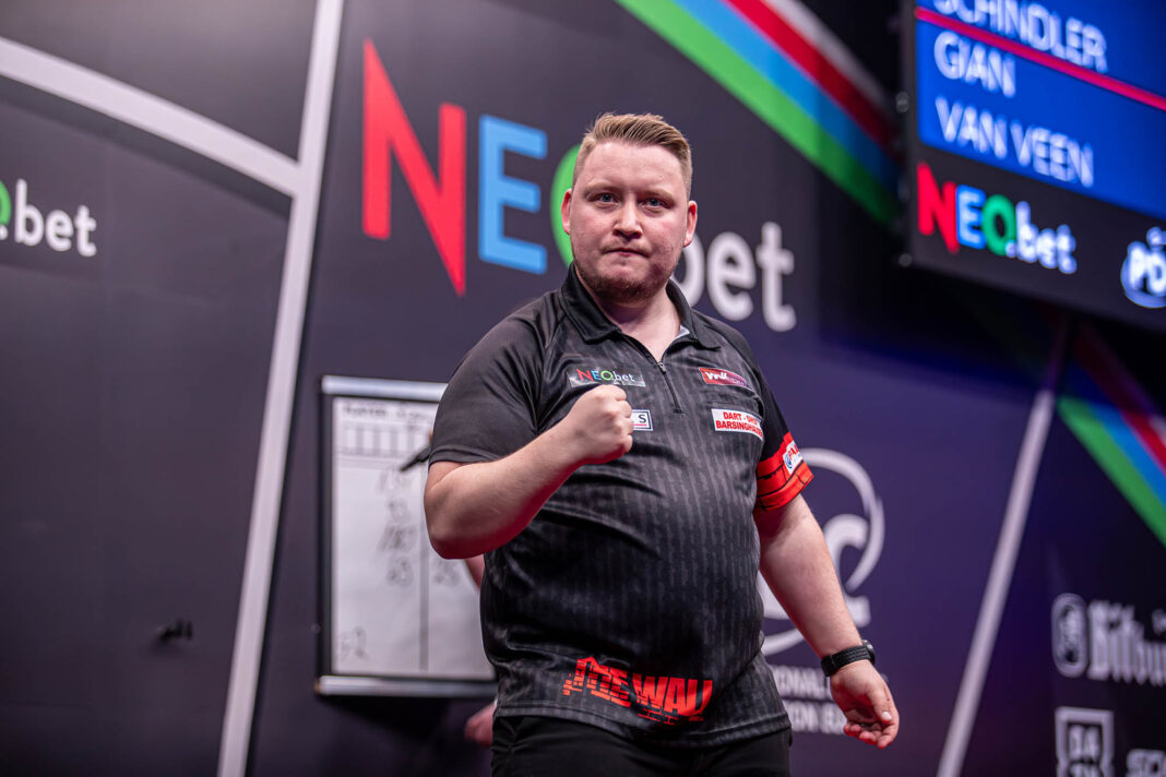 Schindler lifted his first PDC title at last weekend’s International Darts Open, and Germany’s new number one maintained his sparkling form to dump out European Championship semi-finalist Gian van Veen.