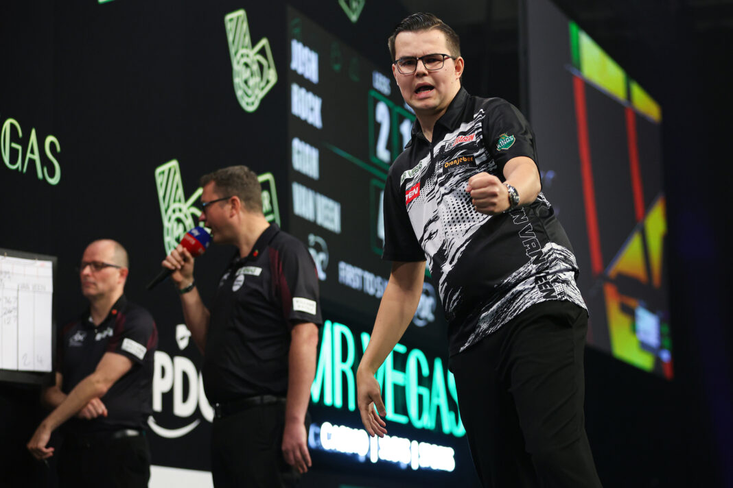 Van Veen (pictured) averaged 110.79 to complete a superb 5-2 victory over 2023 quarter-finalist Rock, converting 126 and 127 checkouts alongside legs of 10, 11 and 12 darts.