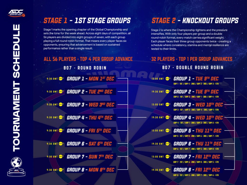 Stage Two fires up on Tuesday 9 December at 1 p.m., when the new Group 1 hits the oche. Later that evening, at 7:30 p.m., another group takes to the stage – a slightly later start and a much nicer lie-in for that quartet. Only the group winner survives; the rest are waved off with a polite ‘Merry Christmas, and thanks for playing.’